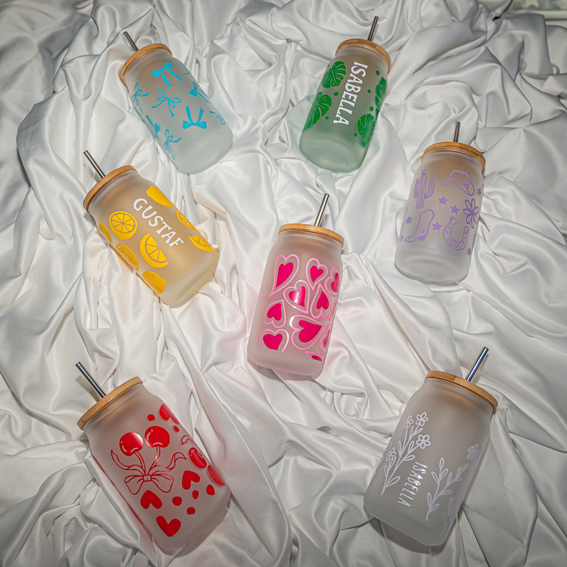 En perfekt kombination av funktion och personlig design. Muggarna är tillverkade i tåligt glas och levereras med lock och sugrör, vilket gör dem idealiska för kalla drycker som iskaffe, lemonad eller smoothies.